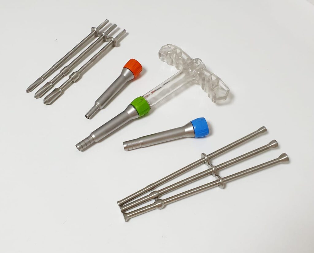Küçük Eklem OATS (Osteokondral Otogreft Transfer Sistemi) Seti, silindirik bir osteokondral greftin belirlenmesini, alıcı soketin hazırlanmasını ve donör alımını kolaylaştıran tek kullanımlık, steril bir settir. Alıcı soket, bir rehber pim ve aynı boyuttaki matkap ucu kullanılarak hazırlanır (donör hasatçı ile anatomic basınç uyumu için eşleştirilmiştir.